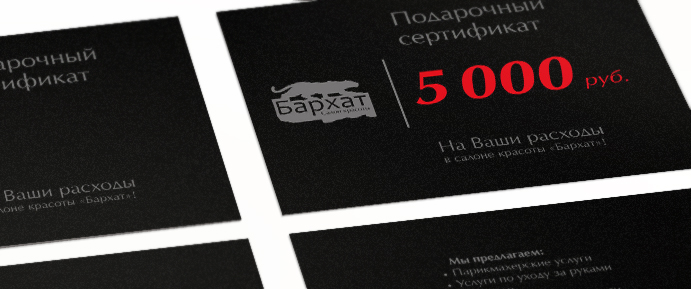 В салоне красоты «БАРХАТ» вы сможете приобрести подарочный сертификат, это отличный подарок для Ваших близких и знакомых к Новому Году, дню Рождения, 8 марта, 23 февраля, дню всех влюбленных или другой знаменательной дате.